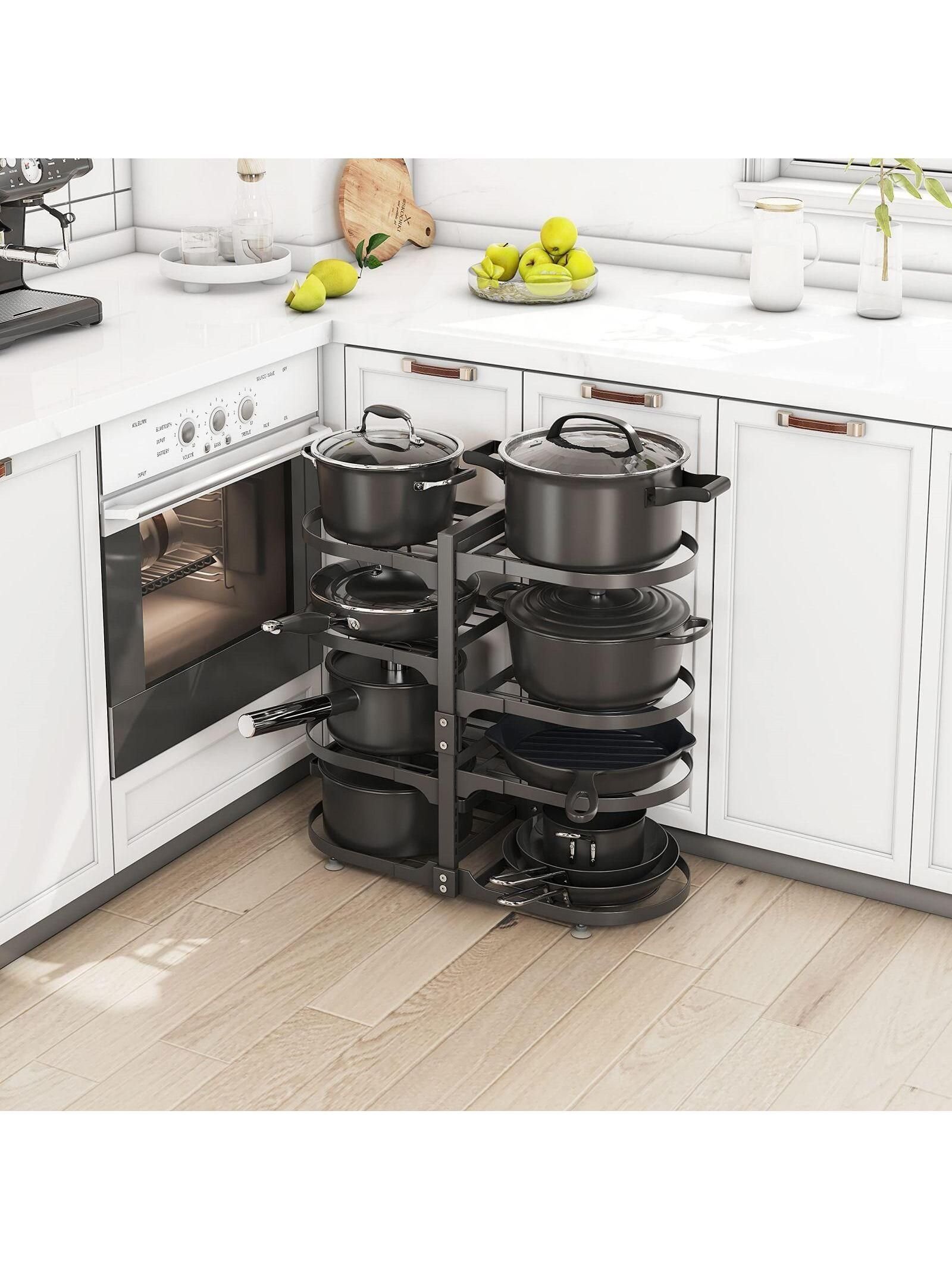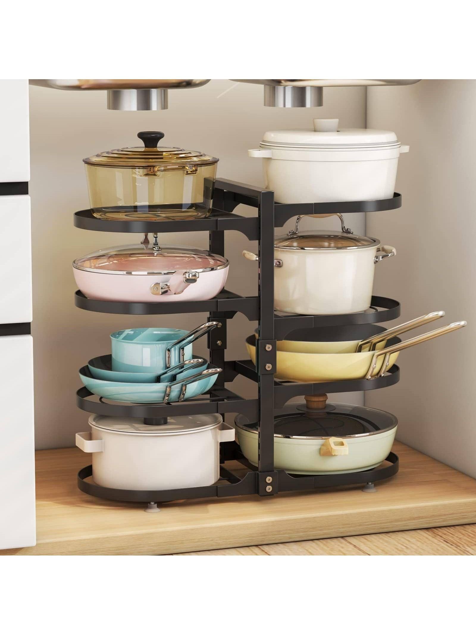 [Adjust the Height As Needed] You can adjust the height of each tier of the pot and pan organizer for cabinet so you don't need to worry about the shelves not having enough space to fit your pots. Before purchasing, measure your cabinet size and read the product dimensions carefully to make sure our adjustable pan organizer fits inside your cabinet. Please refer to the product pictures for more detailed dimensions