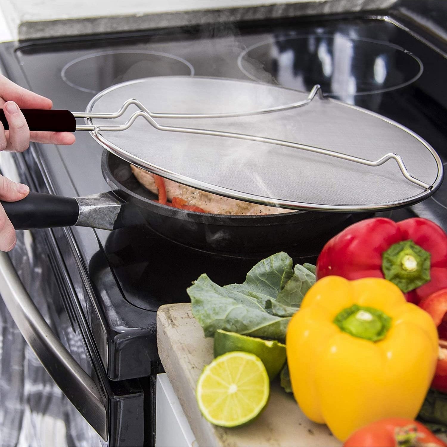 *Multi-Usage*:Made from a rust-proof fine wire mesh screen with a durable thick twill weave; our Grease Splatter Screen can be used as a fine mesh strainer; steamer; a cooling rack and also used as a splatter screen guard to avoid the dangers of hot oil; grease; boiling water and food particles from splattering.