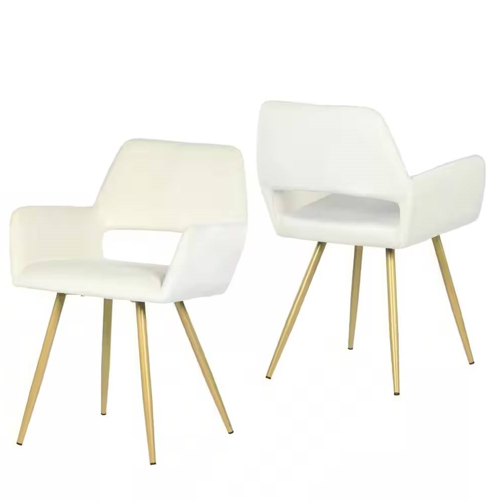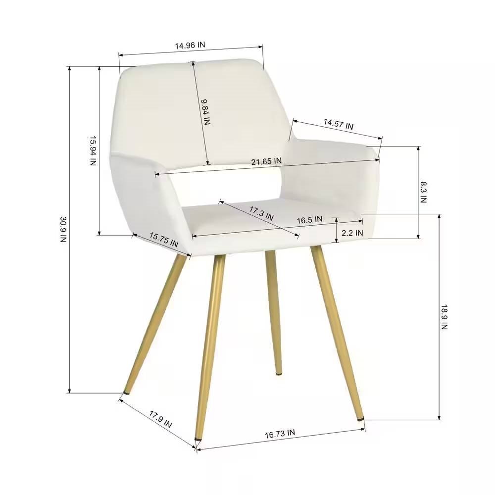 Step into Scandinavian elegance with our Set of 2 Modern Ivory Velvet Upholstered Dining Chair with Gold Metal Legs, sized at 21.5 x 22 x 31 in. and packed 2-per carton. Beyond its sophisticated design, it offers a velvety touch for ultimate comfort. The zipper detail, unique armrest, and cut-out back stand out, while its metal legs with a wood-grain finish and non-slip mats ensure stability and floor protection. Holding up to 250 lbs., it's perfect for any space, from dining to office. And no assembly woes here - just snap the seat into the legs, and you're set. A blend of comfort, style, and ease, all in one.
