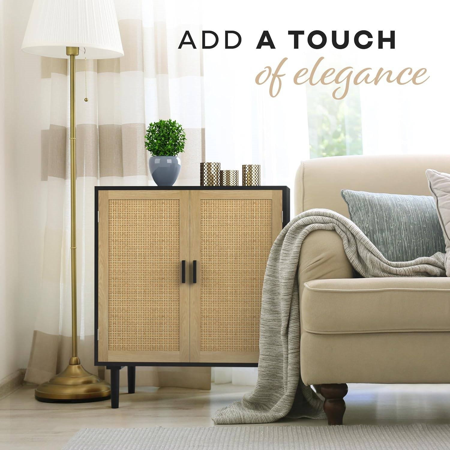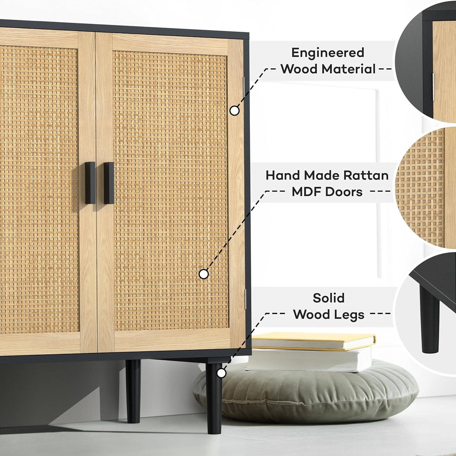Enhance the ambiance of your bedroom or living room with this Mid-Century Modern Rattan Sideboard Table Buffet Cabinet in Black Wood Finish. Its sleek boho design helps elevate the space in your house to feel more relaxed, and decor you'll be proud to show off to your guests! Measuring 31.5" Wide x 15.8" Deep x 34.6" Tall, this rattan sideboard cabinet features 2 levels of storage space in the interior to hold large everyday essentials or accessories such as dishes, books, and other household decor. The top level can be used to place other home furnishings such as vases, photo frames, or books. This Mid-Century Modern Rattan Sideboard Table Buffet Cabinet in Black Wood Finish is timeless and can be placed anywhere in the house to create the comfortable and natural aesthetic you are looking for. Whether it be in the dining room, hallway, entryway, or living room, this Mid-Century Modern Rattan Sideboard Table Buffet Cabinet in Black Wood Finish will effortlessly complement any interior decor style. You can even place 2 or even 3 side by side and you have a media console table supporting up to a 65" TV. This nightstand is crafted using high quality particleboard to ensure durability through years of long term use. It is very easy to assemble in under 20 minutes with all hardware provided and easy to read instructions. Per feedback from customers, we received a lot of complaints regarding its difficult installation. The assembly is difficult, particularly when installing the doors, which will require 2 people. However, with help, it is much easier.