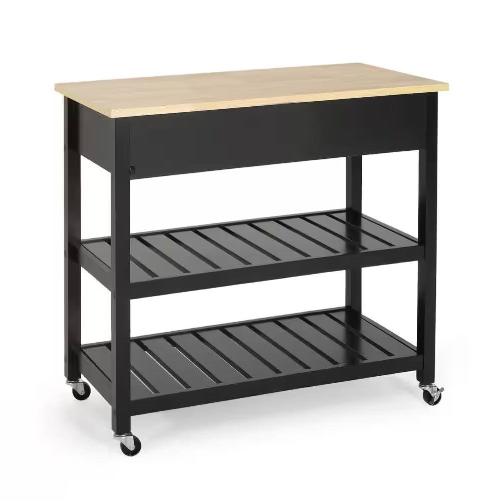 • Modern Black Kitchen Island Cart with Wood Top 2 Drawers and 2 Bottom Shelves