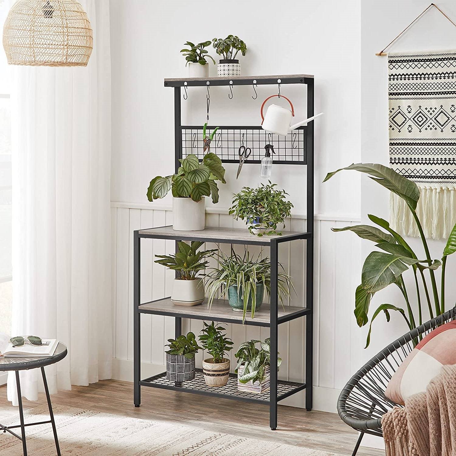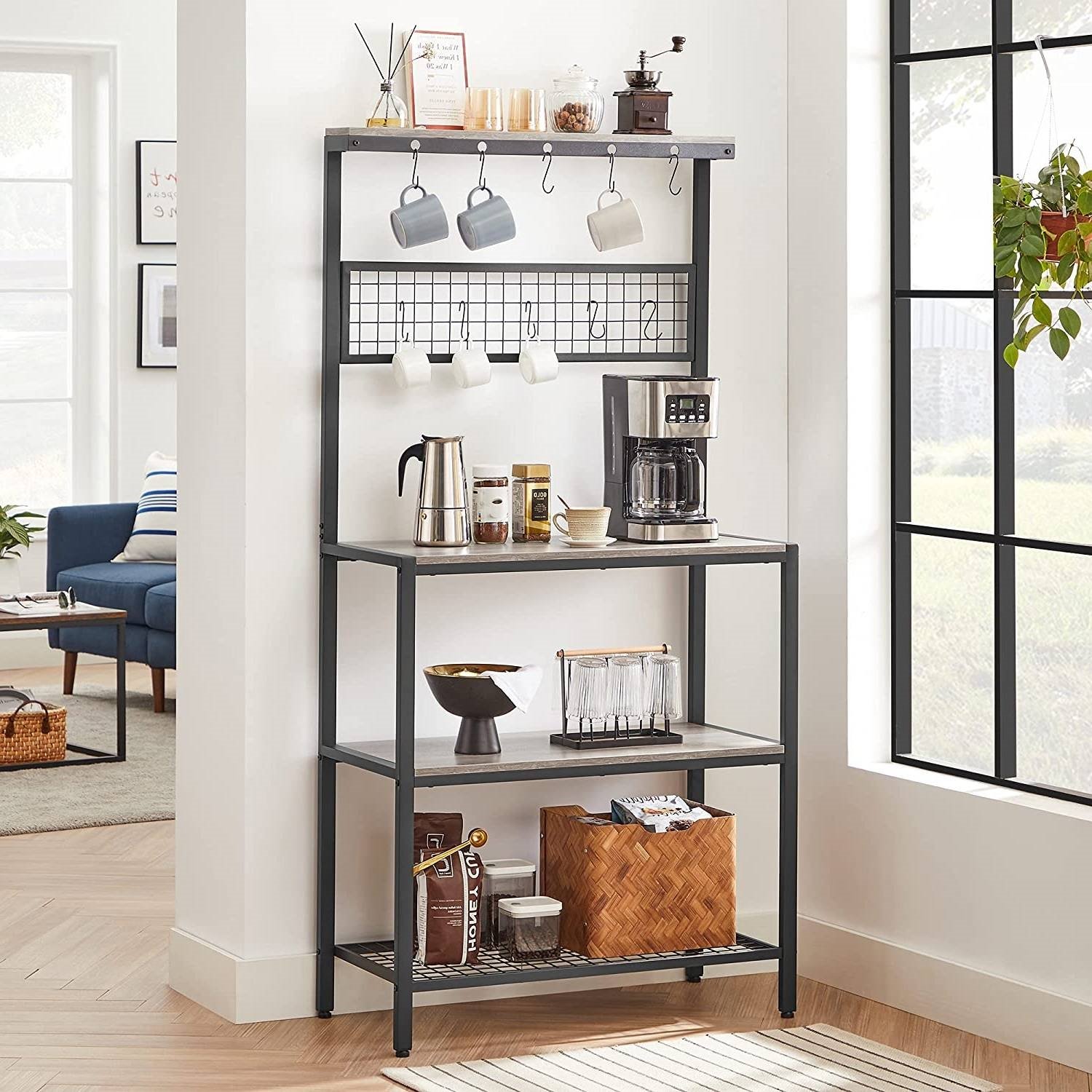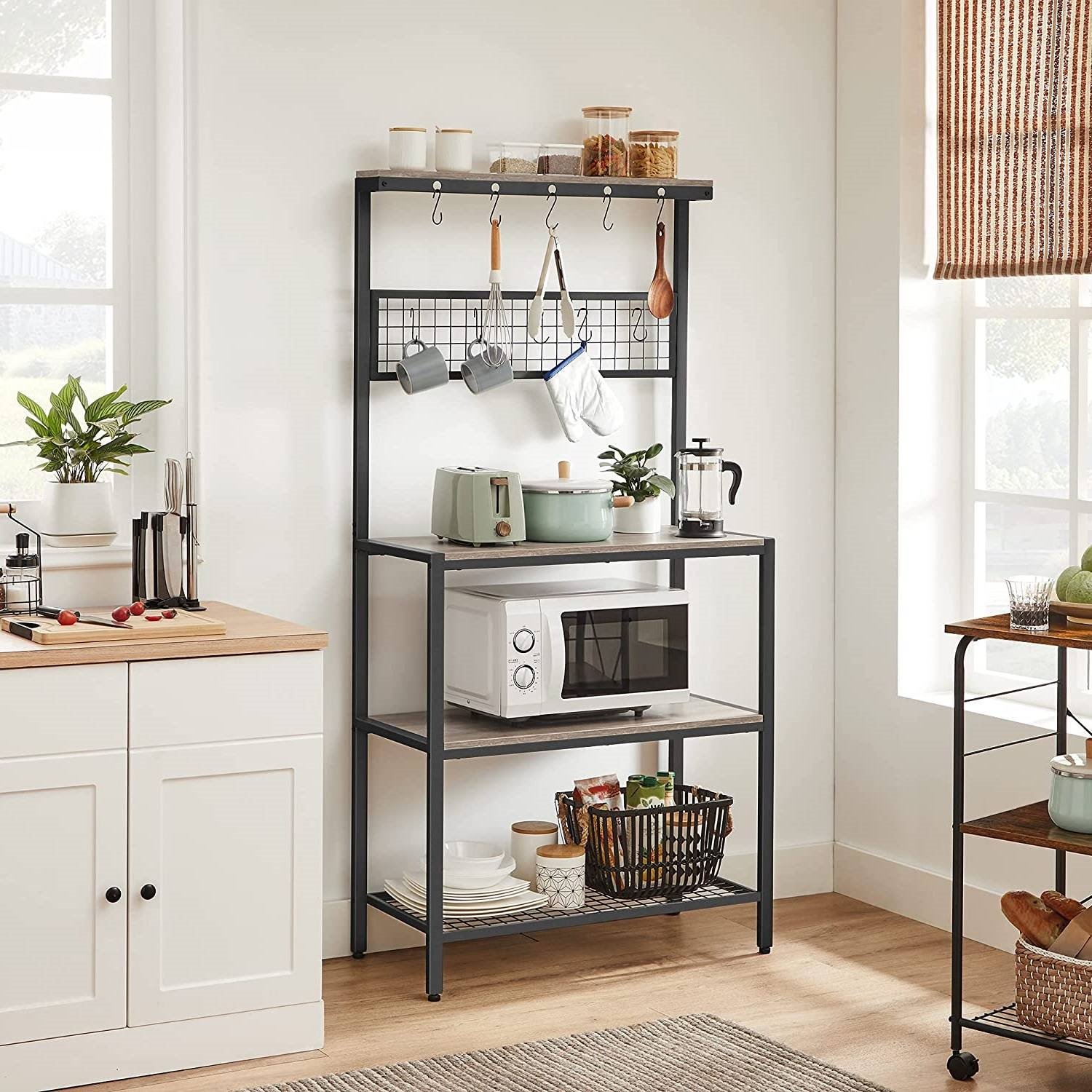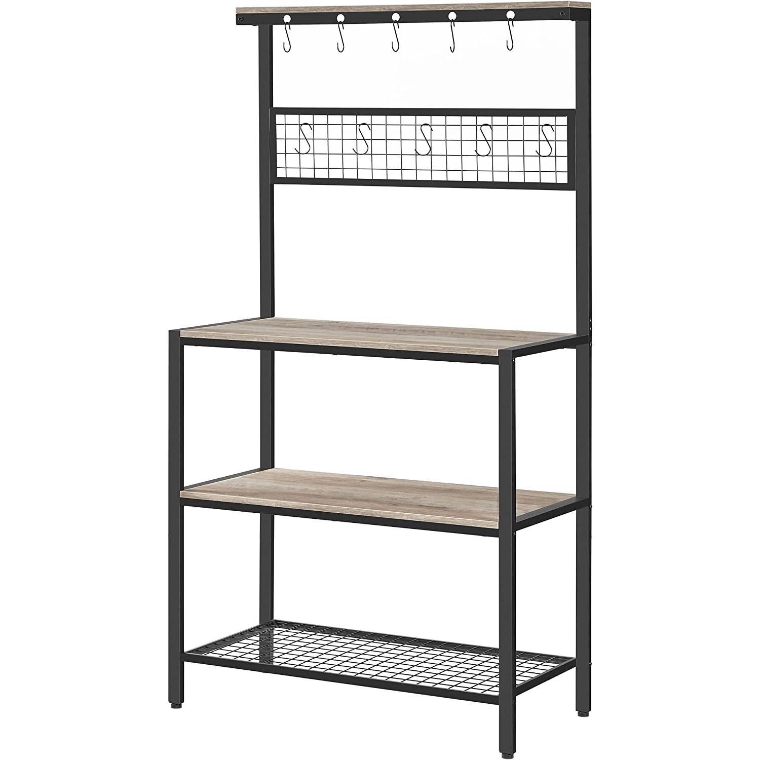 Create your insta-worthy dream kitchen with this Modern 3-Shelf Black Metal Light Grey Wood Kitchen Baker's Rack Microwave Stand. Combining an steel frame and wooden shelves, it adds uniqueness without losing the pleasant atmosphere for you to enjoy freshly baked pizza. Oven, Microwave, Coffee Machine: If all of these are essential items for you, don’t worry! Strong steel frame and quality 15 mm thick particleboard have the strength, so you can put nearly all you need on this kitchen shelf: Place pots on the 3 shelves, customize the mesh panel by hanging cups and potholders, leave ladles and spatulas on the top hooks, and use the top narrow shelf for spice jars—now it's up to you! You don’t need to an expert on the assembly of this kitchen shelf, as it comes with numbered parts and step-by-step instructions to make it easy-peasy.
