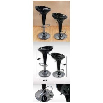 This Set of 2 Ice Cream Scoop Style Barstools in Black will add high style to your home, office, or restaurant/bar. Painted to a glossy finish and features a bright chrome base and footstool with matching colored collar above the base. Each chair swivels and adjusts to bar and counter height. Gas operated pump is tested to 100,000 operations. Adjustable seat height of 22"-30".