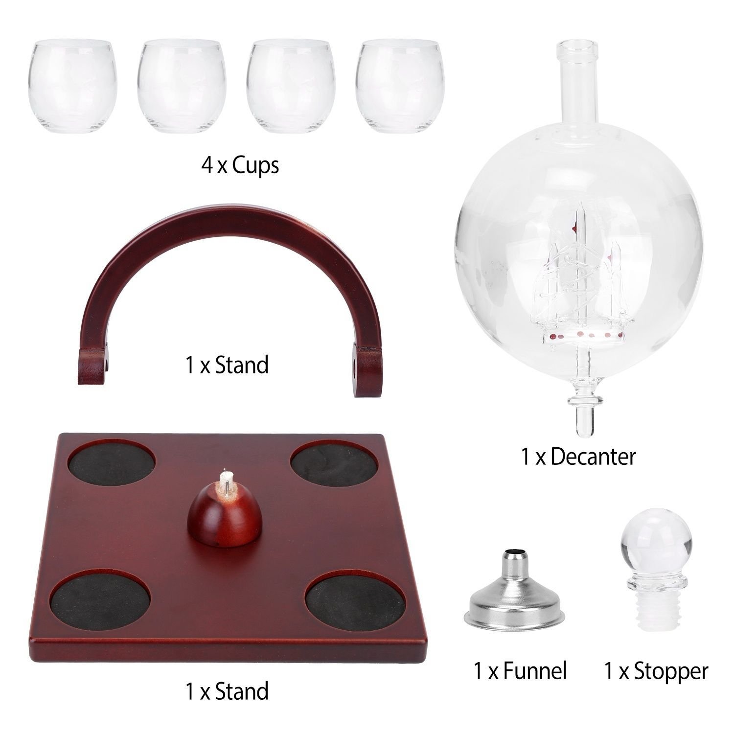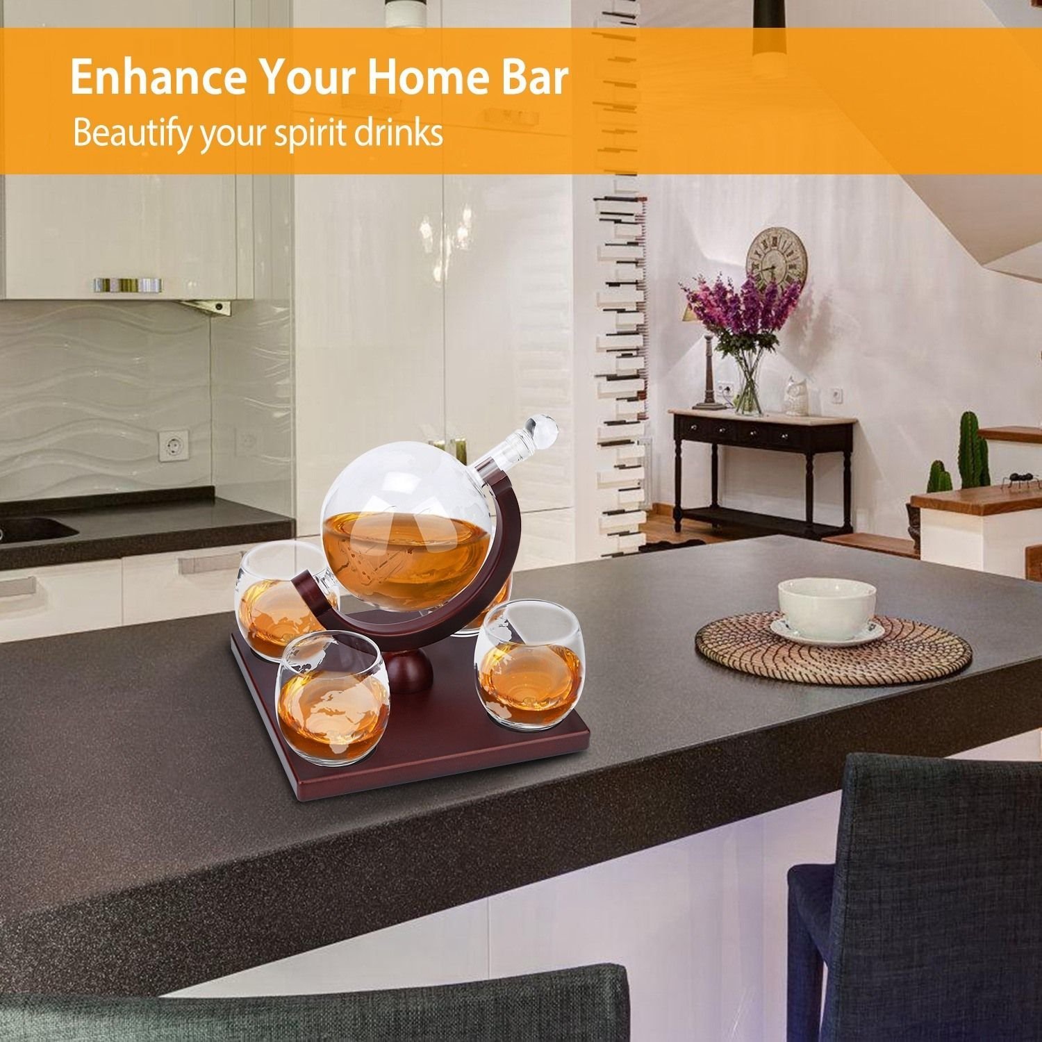 *Beautiful Decoration*:Unique complete elegant whiskey decanter set; includes an globe design decanter and unique antique ship inside; accompanied by four matching classic glasses masterly and a OSB wooden tray; which can perfectly decorate your home or enhance your bar.